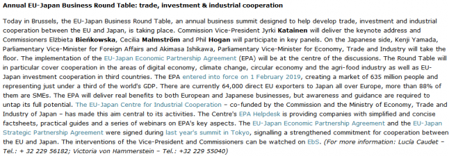 The European Commission daily Midday Express briefing issued a statement linking the BRT, the EU-Japan EPA and the EU-Japan Centre for Industrial Cooperation (the BRT's Secretariat):